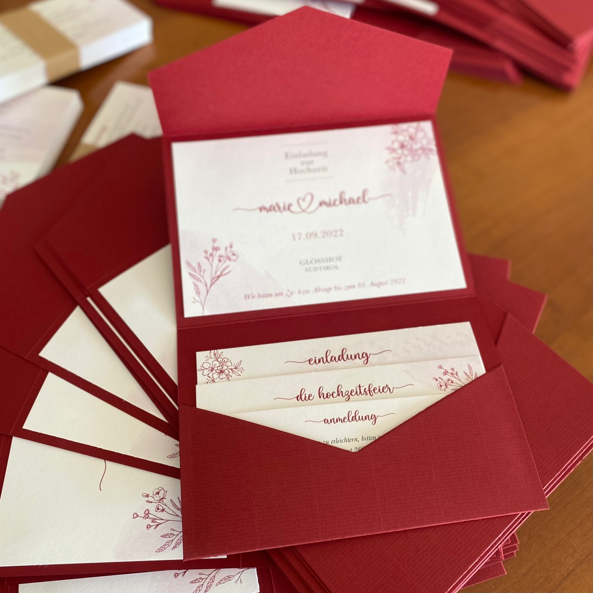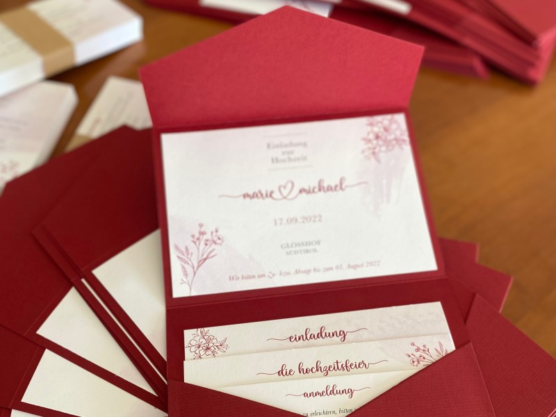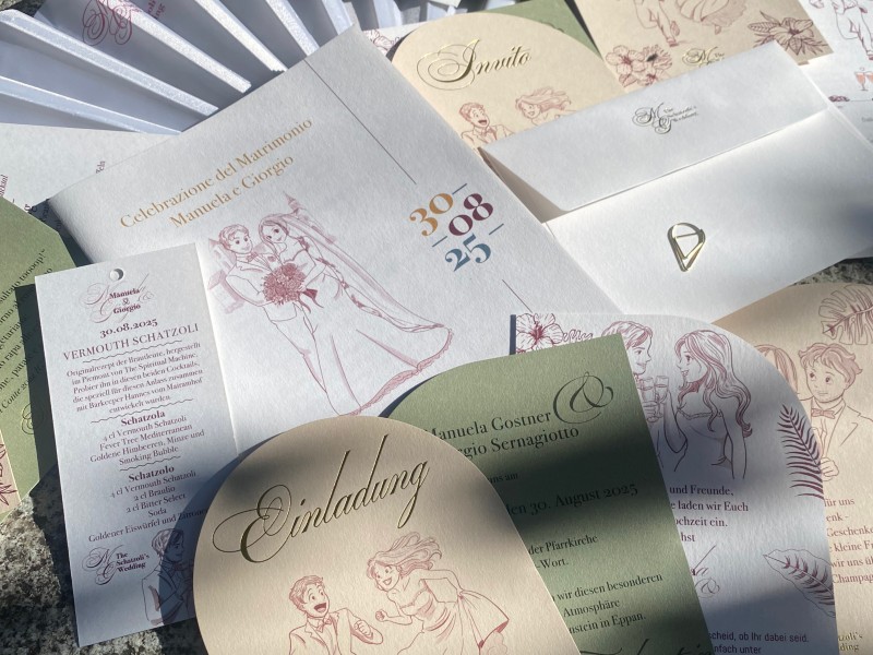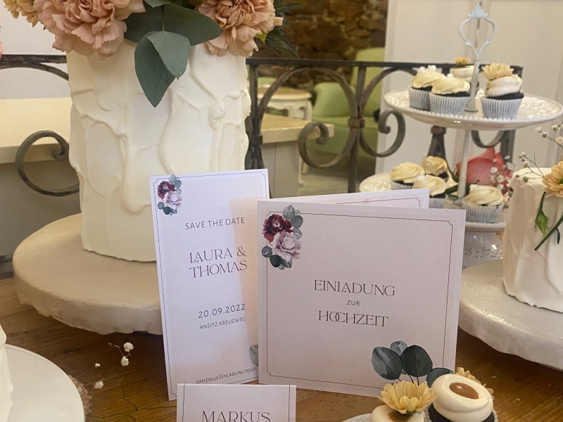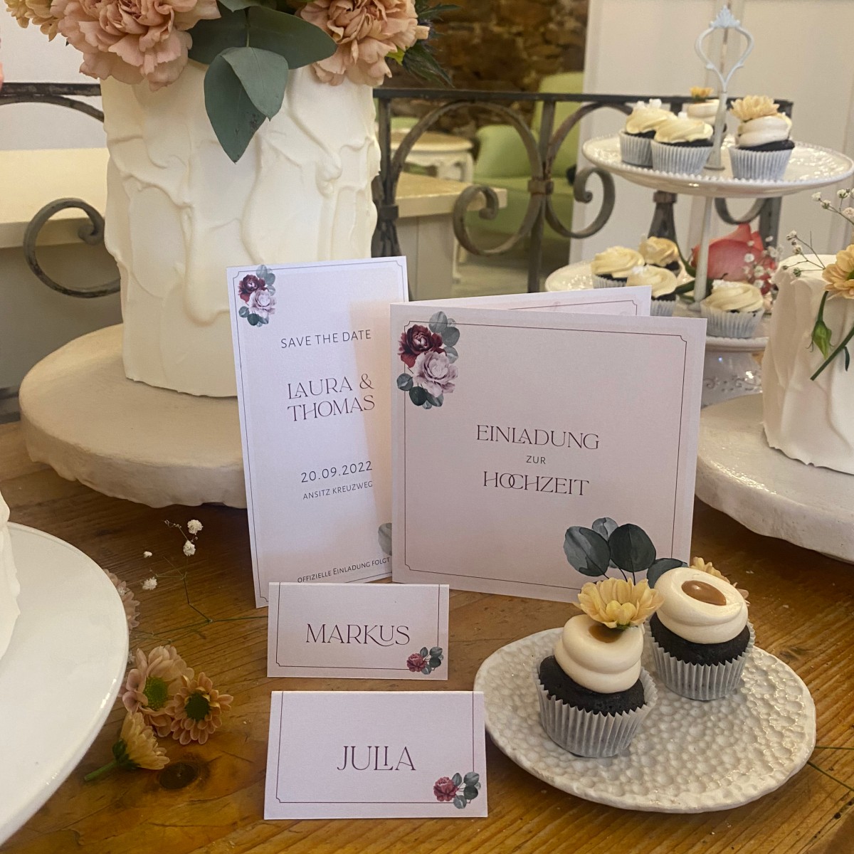 Gestaltung von „Save the Date“ (digital oder Print), Einladungen, Menü, Kirchenheft und Postern